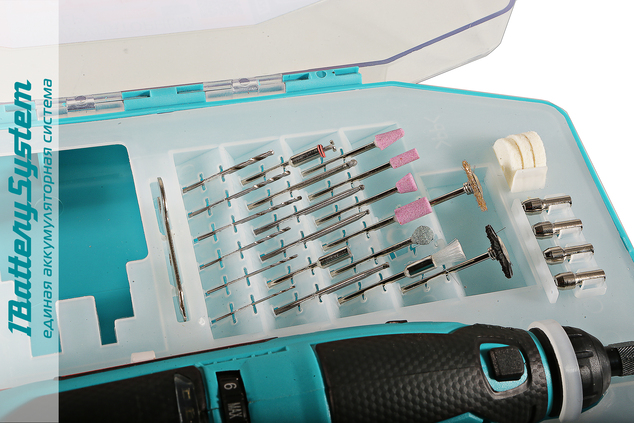 Данная модель является частью системы 1BatterySystem12V и совместима со всей линейкой аккумуляторного инструмента. В комплект входит 1 аккумулятор емкостью 2.0 Ач и зарядное устройство, что позволяет быстро заряжать инструмент и продолжать работу без перерывов. Гравер поставляется в комплекте с 50 насадками, которые позволяют работать с различными материалами и выполнять различные задачи.