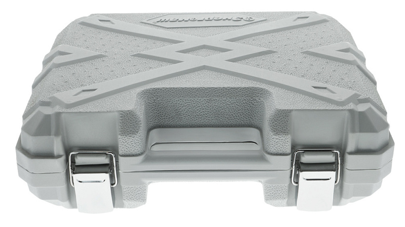 Прочный кейс, крепление для подвеса, ремешок для ношения инструмента на руке карабин-защелка и набор бит в комплекте.