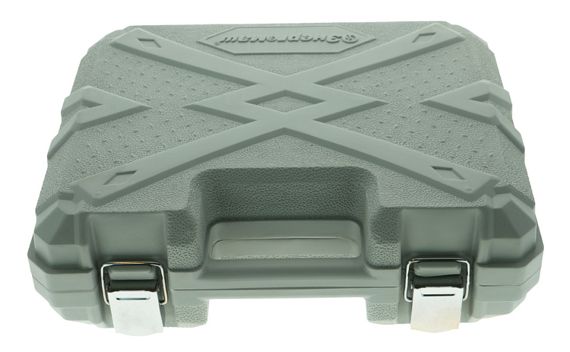 Прочный кейс, крепление для подвеса, ремешок для ношения инструмента на руке карабин-защелка и набор бит в комплекте.