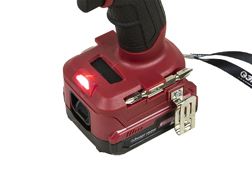 Прочный кейс, крепление для подвеса, ремешок для ношения инструмента на руке карабин-защелка и набор бит в комплекте.