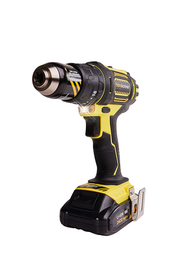 Hanskonner HCD1838RI – аккумуляторный 18 В, ударный, двухскоростной шуруповерт. Является одним из самых мощных и функциональных шуруповертов в своем классе и высокоэффективен не только при работах с крепежом, но и при сверлении в различных материалах, включая кирпич, камень и легкий бетон. Модель оснащена производительным 18 В электромотором и мощным планетарным механизмом High Torque Technology, благодаря чему, демонстрирует высокие показатели по крутящему моменту, достигающему значения в 55 Н м, что примерно в 1.5 больше, чем у аналогов. Имеет две скорости: режим пониженных оборотов (0 – 450 об/мин) предназначен для работ с крепежом, режим повышенных оборотов (0 – 1600 об/мин) – для сверления отверстий в различных материалах. За счет 16-ти ступенчатой муфты регулировки усилия, значение момента затяжки на валу шпинделя можно изменять в широком диапазоне. Важной особенностью Hanskonner HCD1838RI является ударный механизм, обеспечивающий возможность уверенно выполнять сверление отверстий в кирпичной кладке, штукатурке, керамике, легком бетоне. Установка на модели усиленного, цельнометаллического патрона с максимальным диаметром захвата 13 мм, позволяет значительно расширить набор используемой оснастки. Наличие щелчкового фиксатора ClickLock предохраняет патрон от самопроизвольного ослабления в процессе работы. К особенностям Hanskonner HCD1838RI стоит отнести функцию блокировки вала шпинделя, для удобной замены оснастки одной рукой, электронный тормоз выбега двигателя, гарантирующий мгновенную остановку патрона, а также эффективную линзованную LED-подсветку рабочей зоны. Для удобства пользователя, предусмотрена специальная зацепная скоба крепления на пояс. Шуруповерт штатно комплектуется парой литий-ионных (Li-ion) аккумуляторов емкостью 2.4 А ч, с индикацией остаточного заряда, импульсным зарядным устройством с функцией быстрой зарядки (0 – 100% – 60 мин), а также прочным пластиковым кейсом, обеспечивающим удобство хранения и транспортировки.