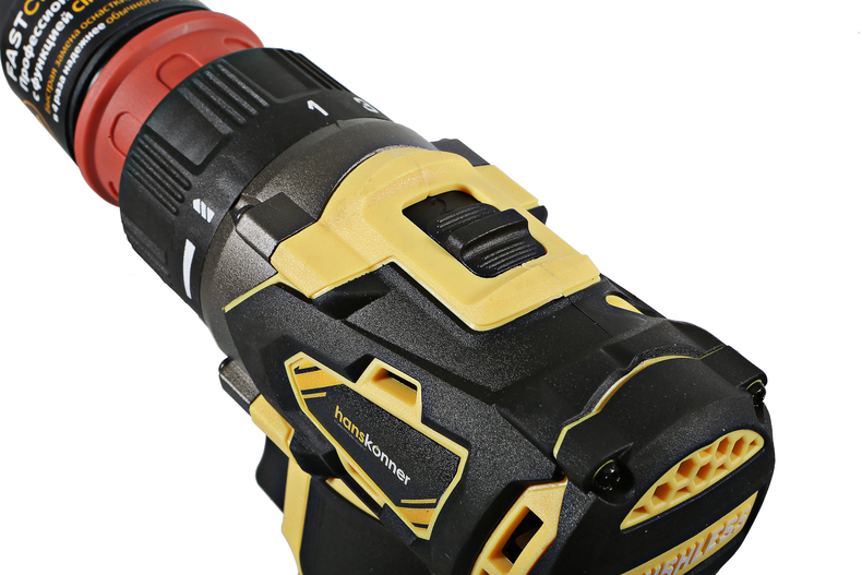 Hanskonner HCD1865BLС Unibattery – универсальный аккумуляторный 18В двухскоростной шуруповерт – относится к линейке Unibattery, обеспечивающей совместимость одного и того же аккумулятора с целым рядом наименований инструмента. Является одним из самых мощных и функциональных шуруповертов в своем классе, и демонстрирует высокую эффективность как при работах с крепежом, так и при сверлении в различных материалах. Модель обладает максимально сбалансированной компоновкой: небольшая толщина корпуса и рукояти позволяет эффективное использование в условиях с затрудненным доступом, а нейтральный центр тяжести, и обилие прорезиненных противоскользящих поверхностей способствуют надежному хвату, и лучшему контролю в процессе работы. Шуруповерт оснащен 18 В бесщеточным двигателем, характеризующимся на 30% лучшей производительностью в сравнении с коллекторными аналогами. Кроме того, бесщеточный двигатель отлично справляется с кратковременными перегрузками и не склонен к перегреву. Благодаря применению мощного планетарного механизма High Torque Technology, Hanskonner HCD1865BLС Unibattery обладает высоким показателем максимального крутящего момента, достигающего 65 Н м. Имеет две скорости: режим пониженных оборотов (0 – 450 об/мин) предназначен для работ с крепежом, режим повышенных оборотов (0 – 2000 об/мин) – для сверления отверстий в различных материалах. Наличие 19-ти ступенчатой муфты регулировки усилия позволяет производить максимально гибкую настройку необходимого момента затяжки. Сменный быстросъемный патрон с максимальным диаметром захвата 13 мм позволяет максимально быстро осуществлять замену оснастки. Предусмотрена функция блокировки вала, способствующая удобству смены оснастки одной рукой. К особенностям Hanskonner HCD1865BLC Unibattery стоит отнести эффективную LED-подсветку рабочей зоны с возможностью принудительного включения, а также индикатор остаточного заряда аккумулятора PowerCheck. Дополнительному комфорту использования способствуют специальная зацепная скоба крепления на пояс, фиксатор для бит, страховочный ремешок на руку. Шуруповерт штатно комплектуется парой литий-ионных (Li-ion) аккумуляторов емкостью 2.4 А ч, зарядным устройством с функцией быстрой зарядки (0 – 100% – 50 мин), надежной дополнительной рукоятью, парой бит. Прочный пластиковый кейс гарантирует сохранность устройства и аксессуаров в процессе транспортировки.