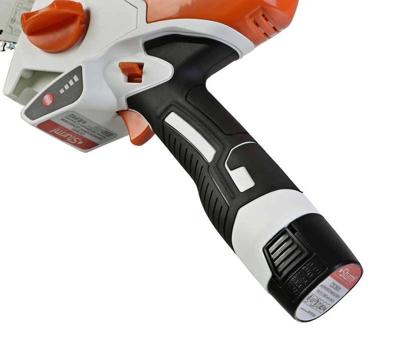 Эргономичная рукоять с противоскользящей прорезиненной поверхностью гарантирует надежный хват для комфортной работы с пилой. Индикатор заряда аккумулятора — для лучшего контроля работы с инструментом.