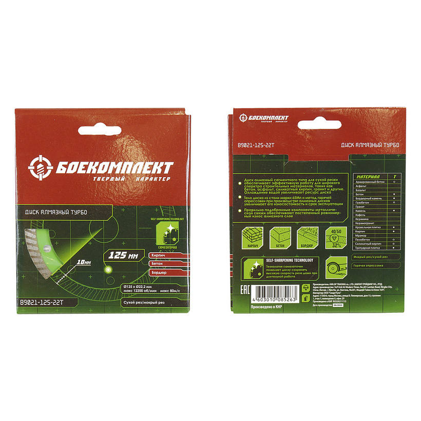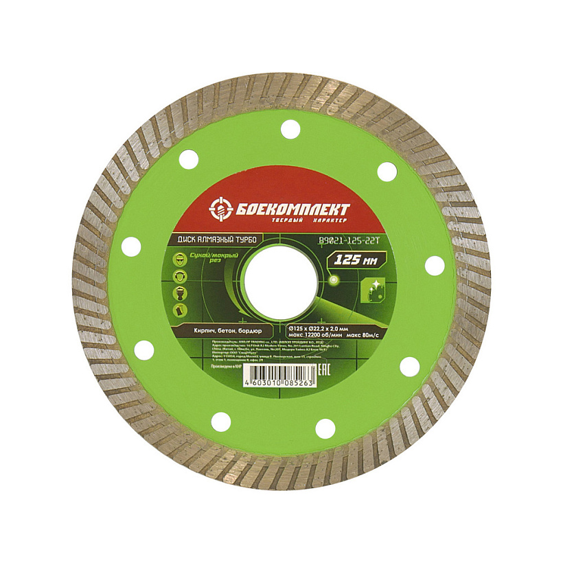 Диск алмазный БОЕКОМПЛЕКТ B9021-125-22T. Диск алмазный TURBO с сегментированным алмазным слоем позволяет работать с широким спекторм строительных материалов, натуральными и искуственными камнями и способен прорезать тонкую арматуру в бетоне. Сухой рез. Охлаждение водой увеличивает ресурс диска. Self-sharpening technology — технология самозаточки, позволяет диску сохранять высокую скорость реза даже при длительной работе. Тело диска из стали марки 65Mn и метод горячей опрессовки при производстве алмазных дисков увеличивают его износостойкость и срок эксплуатации. Правильно подобранные компоненты металлической связки обеспечивают постепенный равномерный износ алмазного слоя.
