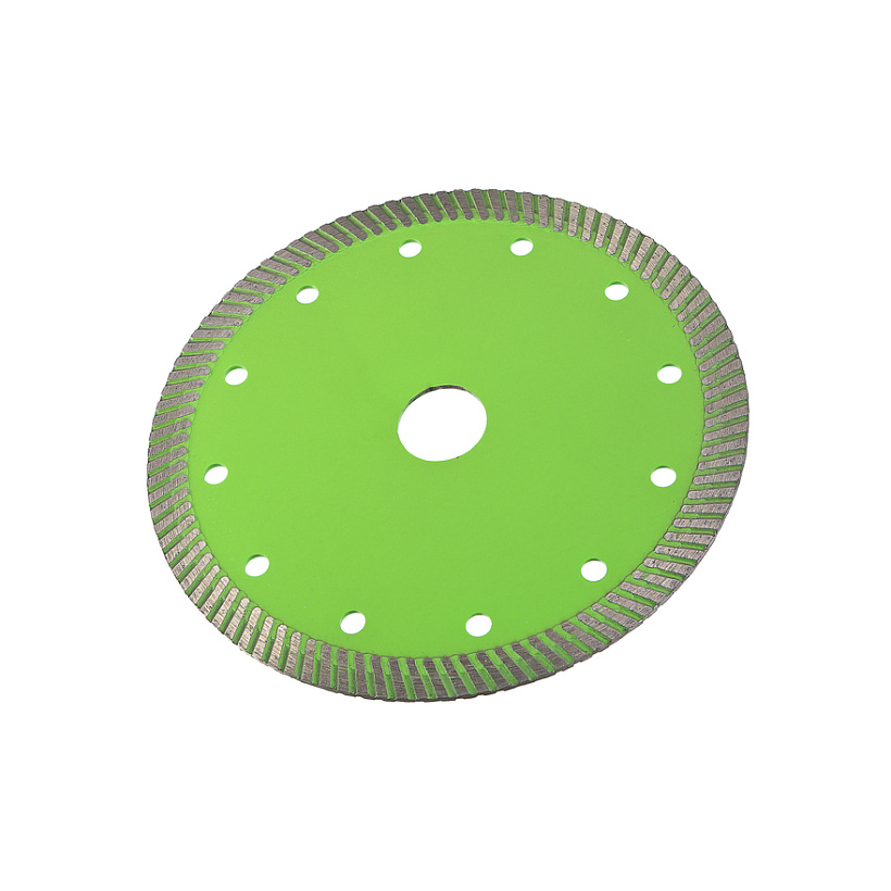 Диск алмазный TURBO с сегментированным алмазным слоем позволяет работать с широким спекторм строительных материалов, натуральными и искуственными камнями и способен прорезать тонкую арматуру в бетоне. Сухой рез. Охлаждение водой увеличивает ресурс диска. Self-sharpening technology -Технология самозаточки позволяет диску сохранять высокую скорость реза даже при длительной работе. Тело диска из стали марки 65Mn и метод горячей опрессовки при производстве алмазных дисков увеличивает его износостойкость и срок эксплуатации. Правильно подобранные компоненты металлической связки обеспечивают постепенный равномерный износ алмазного слоя.