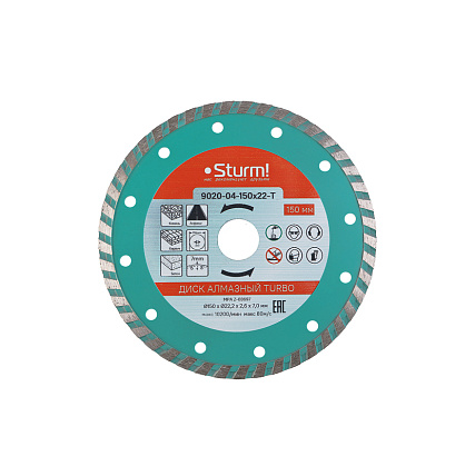 • Диск алмазный Sturm! 9020-04-150x22-T с турбо сегментом для сухой и влажной резки различных материалов: камня, кирпича, бетона, железобетона, бордюра и тротуарной плитки.