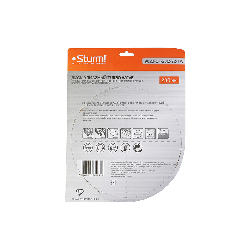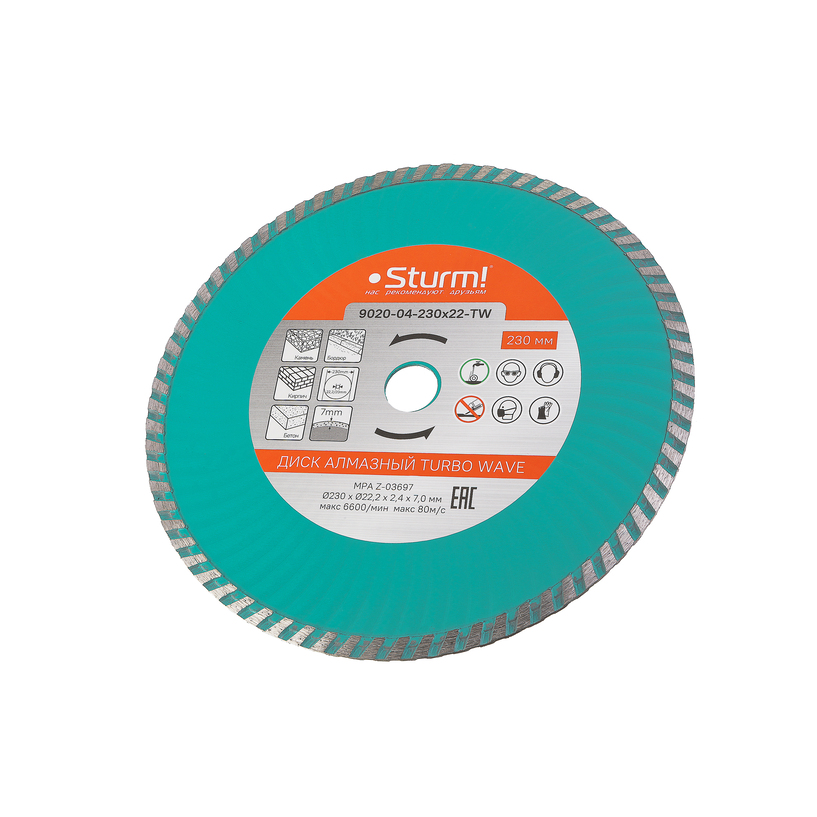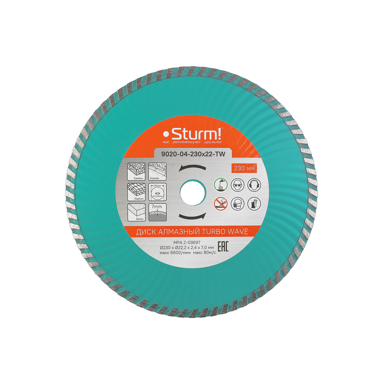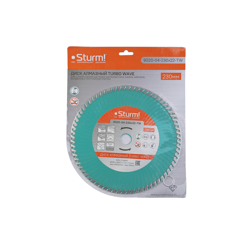 Диск алмазный Sturm! 9020-04-230x22-TW с сегментом турбо-волна для сухой и влажной резки различных материалов: камня, кирпича, бетона, железобетона, бордюра и тротуарной плитки. Режущая кромка с оптимальным содержанием алмазного слоя обеспечивает эффективную работу и низкую износостойкость. Волнообразная форма диска способствуют лучшему охлаждению. Корпус, изготовленный из стали марки 65Г, обеспечивает его прочность и упругость. Переходное кольцо на 20мм в комплекте для использования с электрическим плиткорезом или иным инструментом.