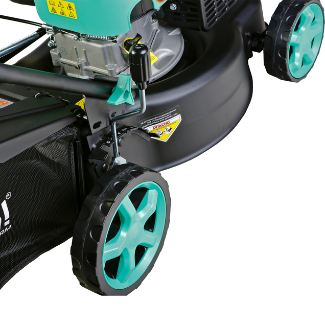Большой быстросъемный 40-литровый травосборник из полиэстера. 5 ступенчатая центральная регулировка высоты кошения от 25 до 75 мм