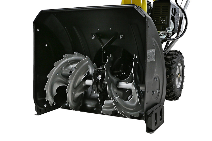 Важная особенность модели Hanskonner HSTG7661EL — наличие системы электрозапуска от сети 220 В: благодаря встроенному электростартеру запуск снегоуборщика максимально удобен и прост даже в условиях низких температур до минус 30 градусов. При необходимости, пользователь может также осуществлять запуск и с помощью ручного стартера. Высокая производительность машины обеспечивается не только мощным двигателем, но и продуманной конструкцией забора снега — этому способствует использование мощных агрессивных шнеков большого диаметра (31 см), позволяющих легко справляться даже с плотным слежавшимся снегом и настом, а также применение вместительного снегозагребного ковша, гарантирующего внушительную, одну из лучших в классе, ширину прохода в 61 см и возможность убирать сугробы до полуметра высотой. Снегоуборщик оснащен надежным металлическим выпускным желобом, с регулировкой по направлению выброса. Поворот желоба осуществляется дистанционно, посредством специального рычага на панели. Кроме того, предусмотрена возможность настройки угла выброса, благодаря которой регулируется необходимое расстояние выброса снежной массы. Максимальная дальность достигает 13 метров.