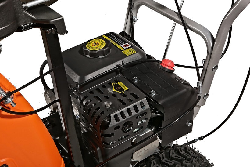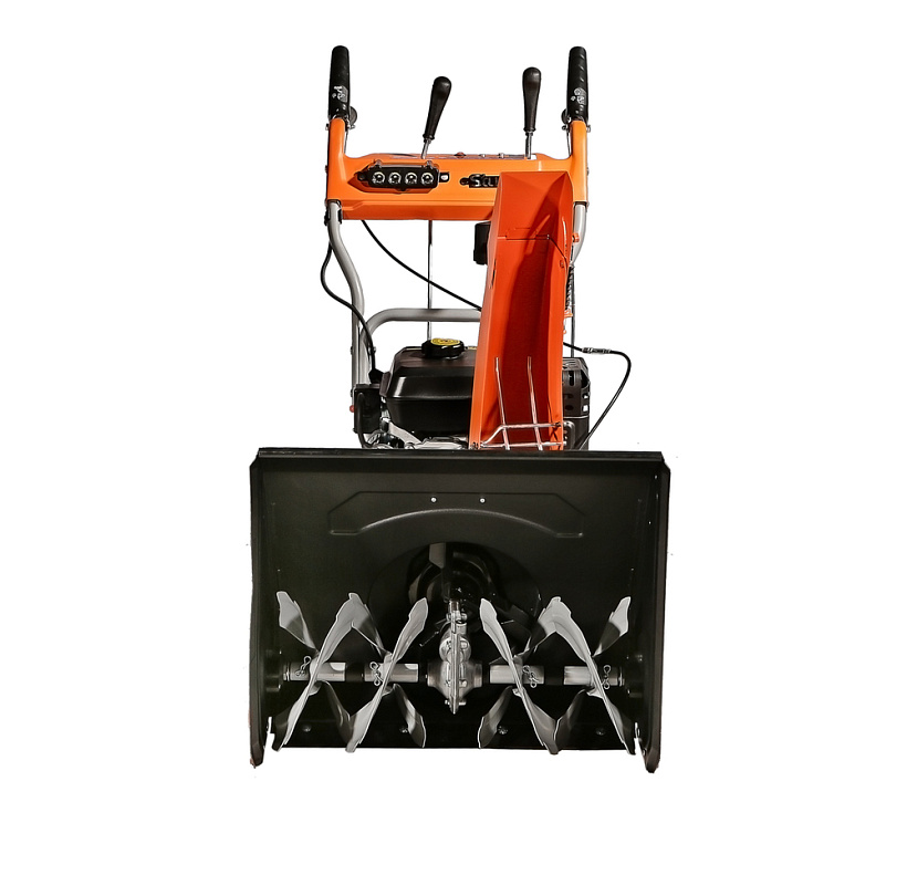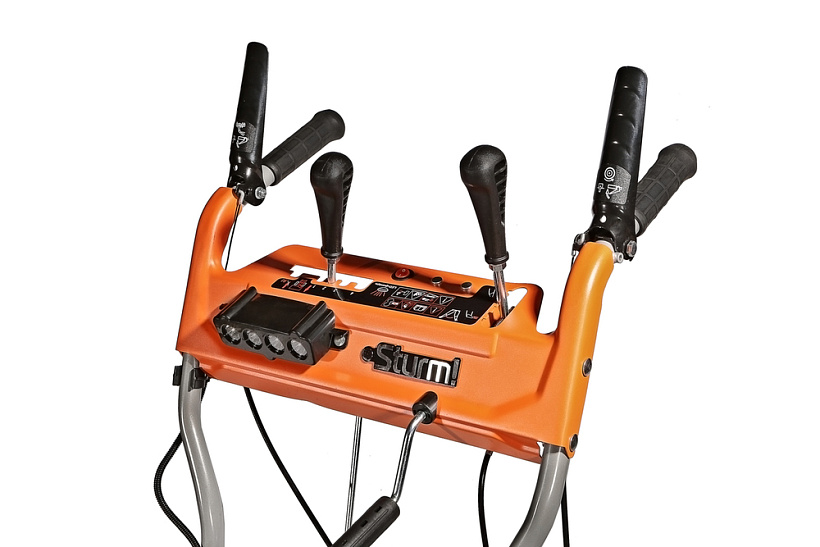 Sturm STG7461EL — универсальный самоходный бензиновый снегоуборщик. Предназначен для расчистки территорий средней и большой площади от снега различной плотности, как свежевыпавшего, так и слежавшегося. Модель оснащена надежным и неприхотливым четырехтактным двигателем KC (рабочий объем 196 см3, мощность 7 л.с.), специально адаптированным для зимней эксплуатации, а также многоступенчатой трансмиссией, значительно повышающей универсальность машины. Конструкцией предусмотрены четыре скорости движения вперед и одна назад. Низшая передача применяется при уборке плотно слежавшегося и мокрого снега, средние передачи — для работы со свежевыпавшим снегом, высшая передача — транспортный режим, предназначенный преимущественно для перемещения снегоуборщика. Важная особенность модели Sturm STG7461EL — наличие системы электрозапуска: благодаря встроенному электростартеру запуск снегоуборщика максимально удобен и прост. При необходимости, пользователь может также осуществлять запуск и с помощью ручного стартера. Высокая производительность машины обеспечивается не только мощным двигателем, но и продуманной конструкцией забора снега — этому способствует использование мощных агрессивных шнеков с большим профилем зуба, позволяющих легко справляться даже со слежавшимся снегом и настом, а также вместительного снегозагребного ковша, гарантирующего внушительную ширину прохода и возможность убирать сугробы до полуметра высотой. Снегоуборщик оснащен надежным металлическим выпускным желобом, с регулировкой по направлению выброса. Поворот желоба осуществляется дистанционно, посредством специального рычага на панели. Кроме того, предусмотрена возможность настройки угла выброса, благодаря которой регулируется необходимое расстояние выброса снежной массы. Максимальная дальность достигает 11 метров. Удобство эксплуатации в сумерках и темное время суток обеспечивает мощная LED-фара — в условиях короткого зимнего дня ее наличие является важной составляющей эффективной работы. Для лучшего сцепления с поверхностью модель комплектуется широкими пневматическими шинами с глубоким протектором.