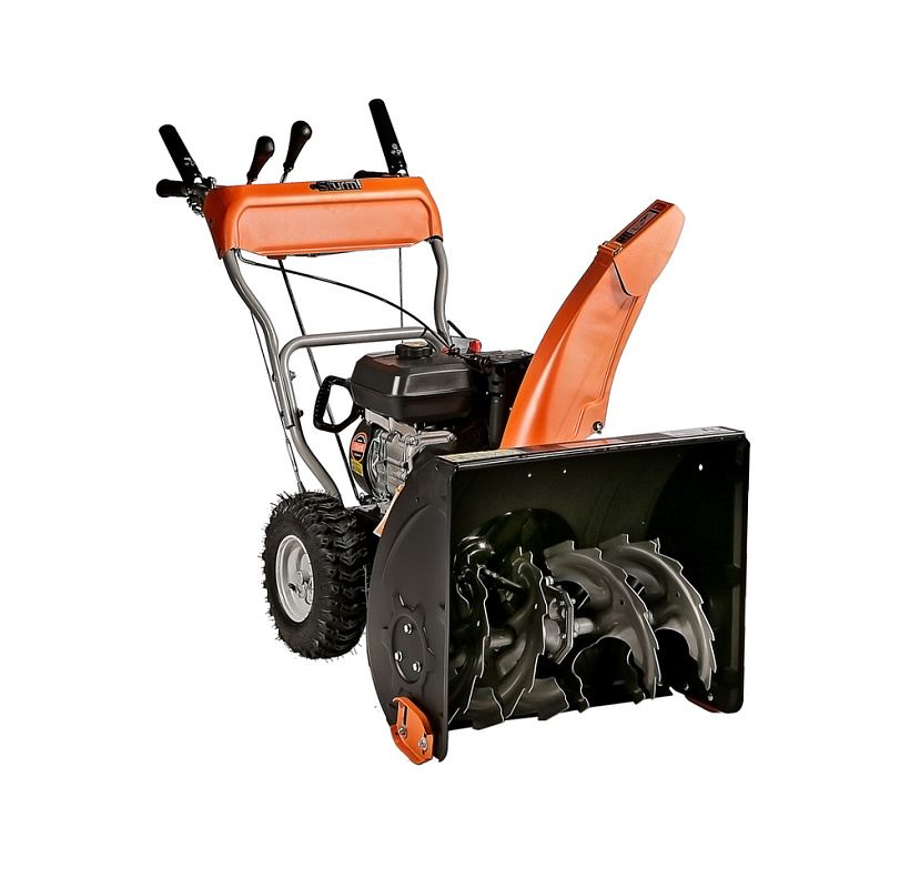 Sturm STG7661 — универсальный самоходный бензиновый снегоуборщик. Предназначен для расчистки территорий средней и большой площади от снега различной плотности, как свежевыпавшего, так и слежавшегося. Модель оснащена надежным четырехтактным двигателем KC, специально адаптированным для зимней эксплуатации, а также многоступенчатой трансмиссией, с шестью скоростями движения вперед и двумя назад. Низшие передачи применяются при уборке плотно слежавшегося и мокрого снега, средние передачи — для работы со свежевыпавшим снегом, высшая передача — транспортный режим, предназначенный преимущественно для перемещения снегоуборщика. Высокая производительность машины обеспечивается не только мощным двигателем, но и продуманной конструкцией забора снега — этому способствует использование мощных агрессивных шнеков большого диаметра (31 см), позволяющих легко справляться даже с плотным слежавшимся снегом и настом, а также применение вместительного снегозагребного ковша, гарантирующего внушительную, одну из лучших в классе, ширину прохода в 61 см и возможность убирать сугробы до полуметра высотой. Снегоуборщик оснащен надежным металлическим выпускным желобом, с регулировкой по направлению выброса. Поворот желоба осуществляется дистанционно, посредством специального рычага на панели. Кроме того, предусмотрена возможность настройки угла выброса, благодаря которой регулируется необходимое расстояние выброса снежной массы. Маневренность и проходимость машины обеспечивают штатные широкие пневматические шины с глубоким протектором.