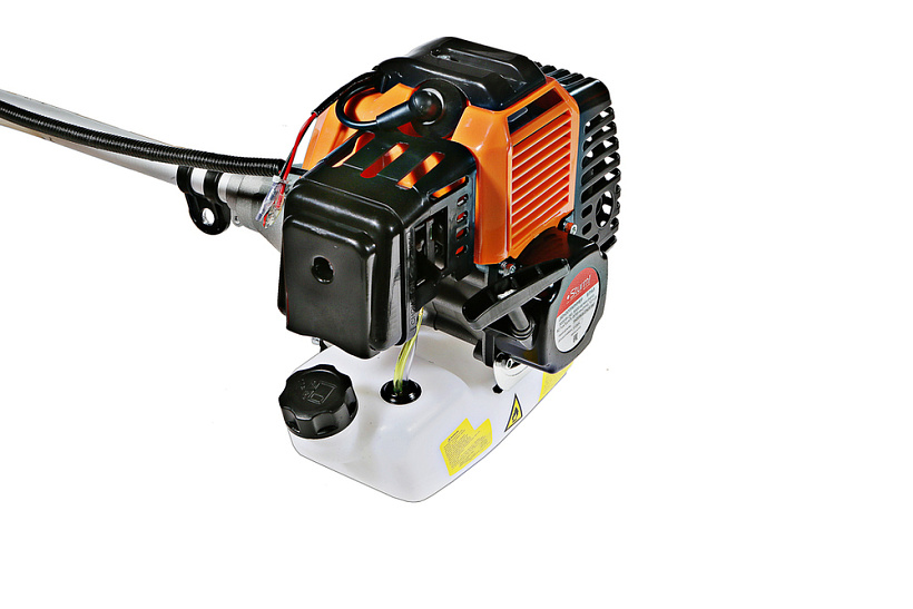 Модель оснащена мощным и экономичным двухтактным двигателем рабочим объемом 42.7 куб см (мощность 3 кВт), позволяющим уверенное использование в качестве режущей оснастки не только косильных головок с леской разных видов, но и металлических ножей, рассчитанных на скашивание густой травы, кустарников, сухостоя. Легкость запуска инструмента гарантирует механизм облегченного старта со специальной дополнительной пружиной. Благодаря праймеру, легкому доступу к свече зажигания, и, полупрозрачному топливному баку модель проста и удобна в обслуживании. Инструмент имеет расширенную базовую комплектацию, куда входят ременной подвес (через одно плечо), косильная головка для лески и фреза.