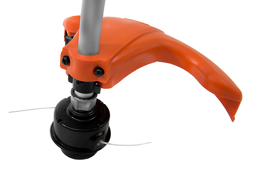 Универсальный защитный кожух можно использовать с ножом- косой для жестких зарослей или кордовой головкой для травы. При этом замена оснастки производится просто и безопасно.