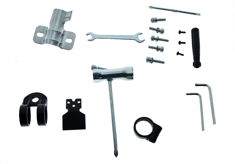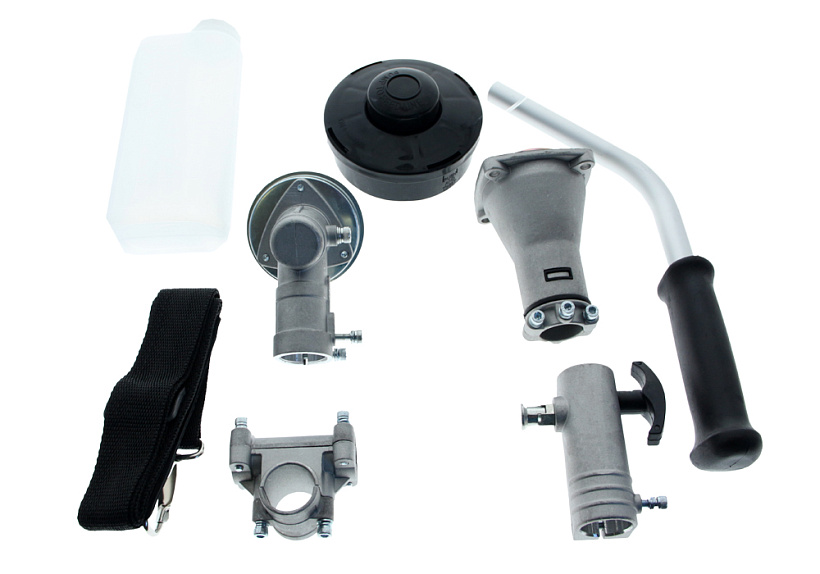 Триммер бензиновый (двигатель с ручкой газа и штанга), Боковая рукоятка, Трехлопастной нож, Катушка с нейлоновой леской, Плечевой ремень, Канистра для топливной смеси, Защитный кожух с винтами (комплект), Нож для срезания лески, Отвертка с торцевым ключом