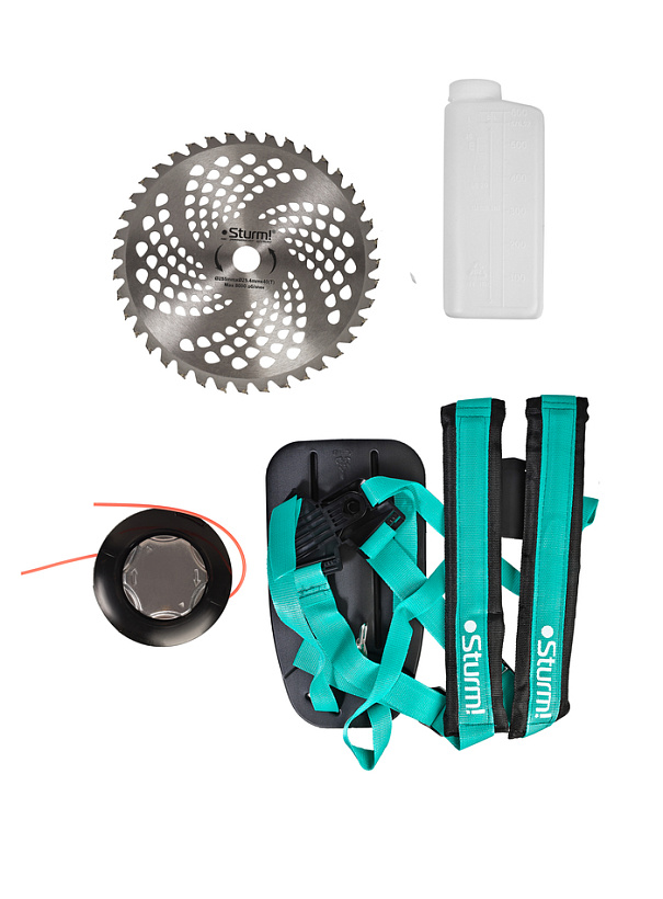 Триммер бензиновый, боковая рукоятка, фреза, шпулька с нейлоновой леской, ранцевый ремень, канистра для топливной смеси, защитный кожух с винтами (комплект), нож для срезания лески, отвертка с торцевым ключом, шестигранный ключ (2шт.), двухсторонний гаечный ключ, двухсторонняя отвертка, стяжка, инструкция по безопасности, инструкция по эксплуатации.