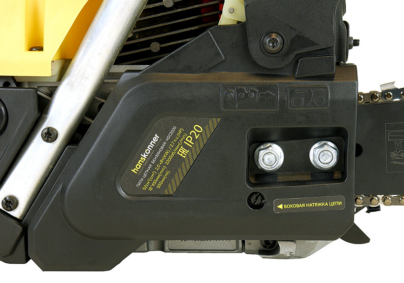 Hanskonner HGC2020 – надежная универсальная бензиновая пила – предназначена для широкого спектра работ: от расчистки лесных насаждений до эксплуатации на приусадебных территориях. Оснащена производительным двухтактным двигателем рабочим объемом 52 куб см (мощность 2.0 кВт / 2.7 л. с.) и пильной гарнитурой увеличенной размерности – 455 мм, что позволяет эффективно использовать инструмент для распиловки древесины различной толщины. В конструкции пилы применен ряд хорошо отработанных и показавших свою эффективность технических решений: хромоникелевое покрытие цилиндра снижает вероятность повреждения его стенок при недостаточной смазке или перегреве, кованый коленчатый вал имеет высокую прочность и хорошо противостоит интенсивным нагрузкам, улучшенный карбюратор и электронная система зажигания гарантируют стабильность работы при различных температурных условиях, высококачественный воздушный фильтр с большой площадью фильтрации защищает двигатель от попадания пыли и посторонних примесей. Также, на пиле установлен масляный насос с регулируемой подачей, что позволяет корректировать подачу масла к пильной гарнитуре в зависимости от условий работы. Снижению уровня вибрации способствует применение многоточечной антивибрационной системы. Инструмент обладает отличной эргономикой: рукояти имеют специальную насечку для удобства хвата, а их форма обеспечивает лучший контроль пилы при осуществлении горизонтальных пропилов и пропилов под углом. Модель проста в эксплуатации и не вызовет затруднений у пользователей, не обладающих достаточными навыками работы с бензопилами. Легкость запуска гарантируют система «легкого старта» со специальной дополнительной пружиной и праймер, обеспечивающий уверенный пуск инструмента в условиях низких температур и после длительных перерывов в эксплуатации. Важной особенностью является боковое расположение механизма натяжения цепи, за счет чего существенно упрощается ее регулировка и исключается риск повреждения рук пользователя от случайного контакта с зубьями цепи. Возможность безынструментального доступа к карбюратору, фильтрующему элементу и свече зажигания гарантирует удобство обслуживания пилы даже в самых неприспособленных условиях.