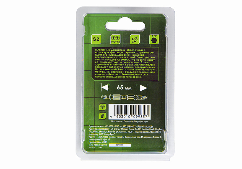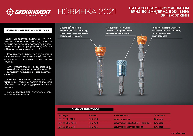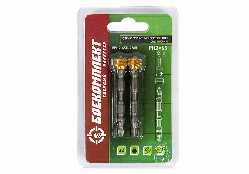 Биты PH2x65мм, со съемным магнитным держ., сталь S2, 2шт, БОЕКОМПЛЕКТ