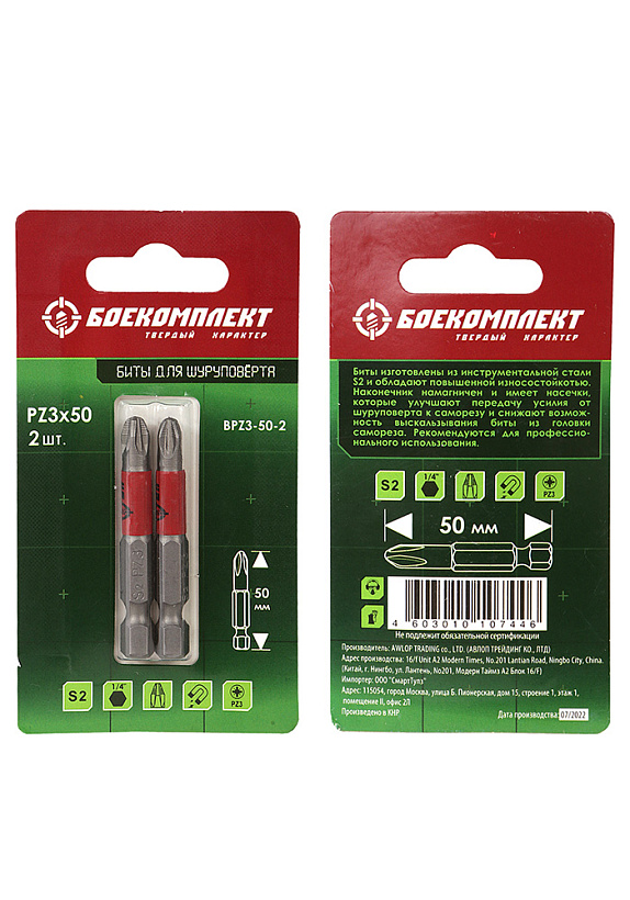 Биты PZ3x50мм, сталь S2, 2шт, БОЕКОМПЛЕКТ