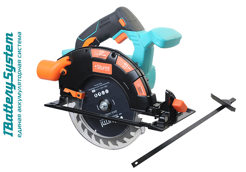 Sturm CCS1867BL – компактная аккумуляторная циркулярная пила с рабочим диаметром пильного диска 165 мм   является частью системы 1BatterySystem и совместима со всей линейкой инструмента данной системы. Инструмент обладает оптимальными массогабаритными показателями и отличной эргономикой, что способствует его использованию без усталости продолжительное время. Дополнительная рукоять обеспечивает лучший контроль, а наличие обрезиненных накладок положительно влияет на надежность хвата. Модель оснащена бесщеточным электромотором Brushless Motor, характеризующимся на 30% большей производительностью в сравнении с обычными коллекторными моторами и лучшей долговечностью. Brushless Motor отлично противостоит кратковременным перегрузкам и не склонен к перегреву. Также, высокую надежность инструмента обеспечивают усиленный редуктор и фирменные пылезащищенные подшипники. Наличие системы плавного запуска SoftStart предотвращает резкие рывки при включении, гарантируя более безопасное и комфортное начало работы. Отличительная особенностью модели Sturm CCS1867BL – увеличенная глубина пропила – 67 мм (при 90 град.), что является рекордным показателем среди циркулярных пил, оснащенных 165мм пильным диском. Защитный кожух и платформа пилы выполнены методом литья, что предотвращает возможную деформацию в ходе использования и положительно влияет на точность реза. Фиксация опорной платформы в требуемом положении осуществляется безыинструментальным способом – с помощью специальных зажимов, что значительно ускоряет и облегчает настройку перед работой. Для большего удобства пользователя модель Sturm CCS1867BL имеет функцию блокировки вала шпинделя, а также эффективную LED подсветку рабочей зоны. Безопасность при работе гарантируют автоматически сдвигающийся в процессе работы защитный кожух, прикрывающий вращающийся пильный диск, а также блокиратор кнопки пуска, предотвращающий случайный запуск пилы.