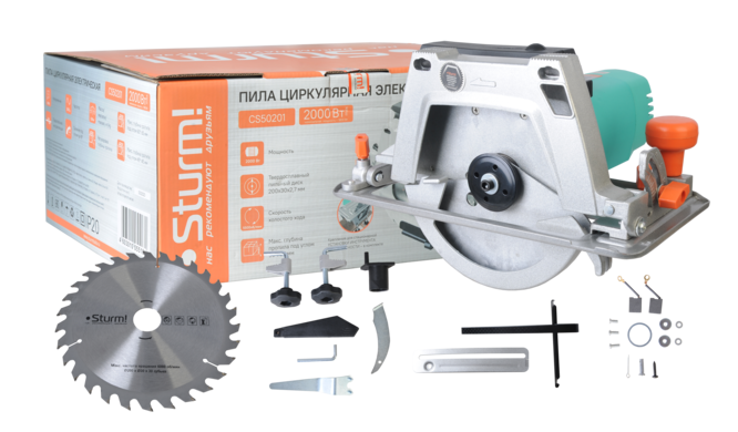 Sturm CS50201 –  многофункциональная циркулярная пила с возможностью стационарной установки. Модель оснащена производительным 2000 Вт двигателем, развивающим скорость вращения 5500 об/мин и уверенно справляется с пропилами глубиной до 65 мм. Для предотвращения заклинивания режущего диска во время работы конструкцией предусмотрен специальный расклинивающий нож. Благодаря регулируемой опорной платформе, пользователь может при необходимости настроить оптимальную глубину пропила. Кроме того, опорная платформа имеет возможность регулировки и бесключевой фиксации в наклонном положении на угол до 45 градусов.  Для максимально точной установки опорной платформы под требуемым углом предусмотрена специальная шкала с насечкой. Важным достоинством модели Sturm CS50201 является возможность стационарного крепления к рабочему столу диском вверх – инструмент можно использовать как распиловочный станок. Удобство смены оснастки обеспечивает функция блокировки вала шпинделя – с ее помощью замена пильного диска происходит быстро и легко без необходимости применения вспомогательного, стопорящего вал ключа. Наличие системы отвода пыли позволяет эффективно удалять опилки и пыль из  зоны резания. Безопасность при работе гарантируют автоматически сдвигающийся в процессе работы защитный кожух, прикрывающий вращающий пильный диск, а также блокиратор кнопки пуска, предотвращающий случайный запуск пилы.