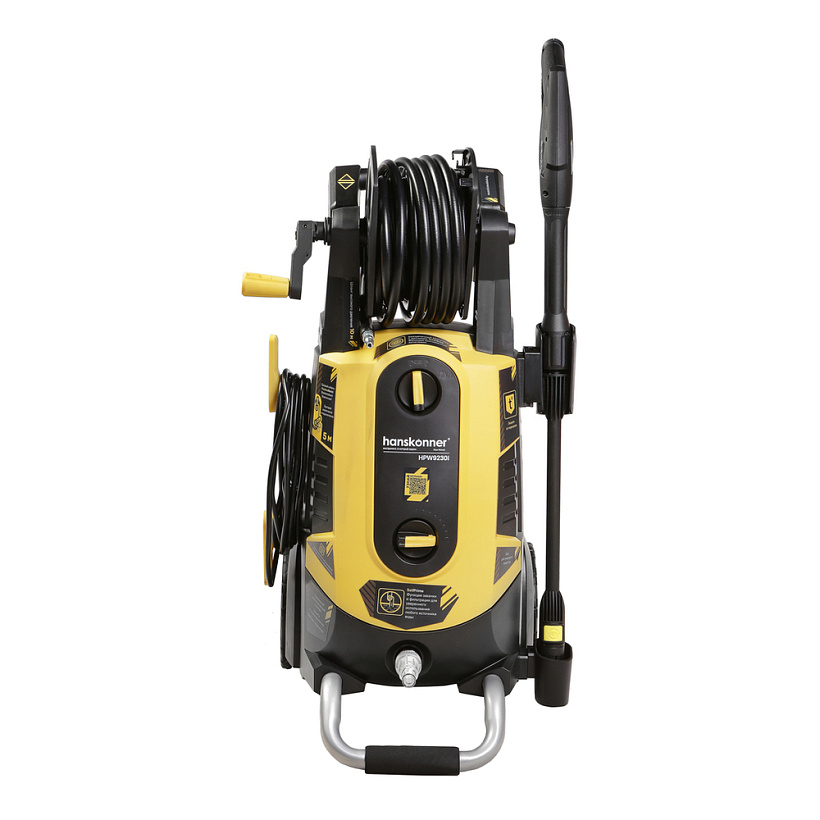 Hanskonner HPW9230I – универсальная производительная мойка высокого давления. Объединяет в себе компактность, отличную эргономику и широкие функциональные возможности. Главная особенность модели – наличие мощного индукционного бесщеточного двигателя, в сравнении с коллекторными аналогами обладающего лучшей износостойкостью и долговечностью, а также характеризующимся низким уровнем шума. Встроенная термозащита и автоматическая система с микровыключателем мгновенной остановки двигателя Total Stop гарантируют безопасную и энергосберегающую работу. Применение в конструкции трёхплунжерной алюминиевой помпы 3D Pump, позволяет мойке демонстрировать высокие показатели производительности (до 450 л/час), и одни из лучших, среди моек аналогичной мощности, показатели по выходному давлению (максимальное давление – 195 бар / рабочее давление – 130 бар) – все это дает возможность с максимальной эффективностью удалять даже самый стойкие загрязнения. Мойка оснащена функцией закачки и фильтрации воды "SelfPrime", обеспечивающей полноценную эксплуатацию устройства даже при отсутствии условий для подключения к стационарному водопроводу – в качестве источника воды можно использовать как водоемы, так и любые подручные емкости. Установленные на модели десятиметровый шланг высокого давления и пятиметровый сетевой кабель гарантируют значительную по площади рабочую зону: позволяют свободно мыть легковой автомобиль, очищать крыши дачных построек и другие объекты без необходимости передвигать мойку с места на место. Для защиты шланга от нежелательных перегибов модель имеет штатную катушку для его намотки, а также оснащена системой "TurnUnwind" для удобства хранения и возможности быстрого разматывания сетевого кабеля. Легкости подключения шланга и оснастки способствуют специальные быстросъемные соединения QuickConnect. Дополнительную функциональность обеспечивает установленный в задней части корпуса бачок для моющего средства с регулировкой подачи, благодаря которому пользователь получает возможность предварительной обработки моющим составом загрязненной области, не прибегая к использованию дополнительного оборудования. В штатную комплектацию мойки также включены внешний пеногенератор, для создания качественной густой пены, дополнительная роторная фреза "TurboNozzle" для работы с сильными загрязнениями, а также специальная защита от опрокидывания, предотвращающая случайное повреждение мойки в ходе использования. Благодаря большим транспортировочным колесам и выдвижной телескопической рукояти модель максимально удобна в транспортировке.