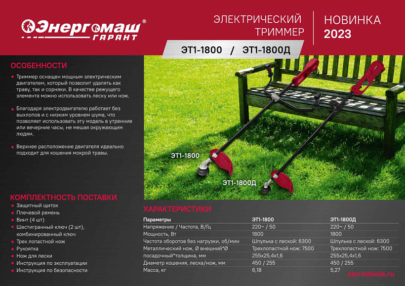 Триммер электрический Энергомаш ГАРАНТ ЭТ1-1800Д оснащен достаточно мощным электрическим двигателем, который позволит удалять как траву так и сорняки. В качестве режущего элемента можно использовать леску или нож.