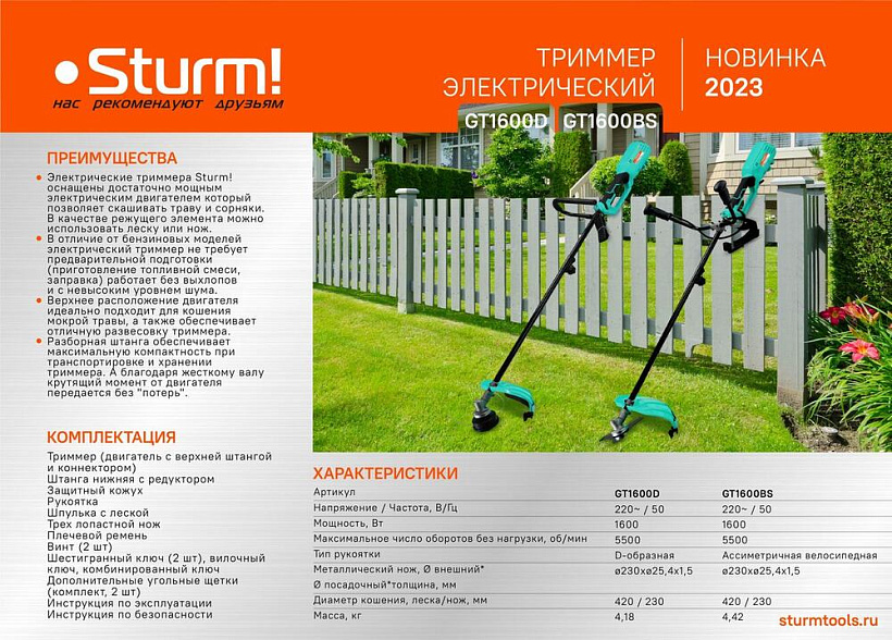 Триммер электрический Sturm! GT1600D оснащен достаточно мощным электрическим двигателем который позволяет скашивать траву и сорняки. В качестве режущего элемента можно использовать леску или нож.