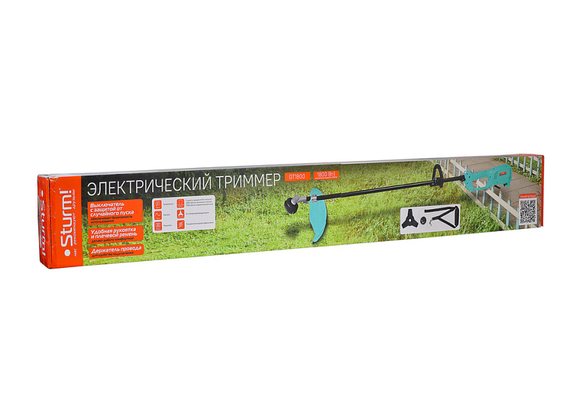 Sturm GT1800 – универсальная мощная электрическая коса для ухода за приусадебной территорией. Имеет компоновку с верхним расположением двигателя, что дает возможность применять ее для скашивания мокрой травы, так как исключается непосредственный контакт влаги с электрочастью. Кроме того, размещение мотора сверху обеспечивает инструменту отличную развесовку. Модель оснащена производительным 1.8 кВт мотором, развивающим максимальную частоту вращения режущей оснастки 7500 об / мин и позволяет уверенно использовать при работе режущую леску максимальным диаметром до 2.5 мм. Благодаря наличию стального приводного вала крутящий момент от двигателя к редуктору передается практически без потерь, что позволяет уверенно использовать не только стандартные косильные катушки, но и металлические трехлопастные ножи для скашивания жесткой, перезрелой травы и бурьяна. Инструмент максимально прост в использовании. Этому способствуют отличная эргономика и небольшой вес. Кроме того, в отличии от бензиновых аналогов, электрическая коса не требует предварительной подготовки (приготовление топливной смеси, заправка), работает без вредного выхлопа и с невысоким уровнем шума. Дополнительный комфорт при работе обеспечивает D-образная рукоять ¬– она позволяет лучше контролировать инструмент и легче обходить преграды. Предусмотрена возможность ее продольной регулировки. Для защиты пользователя от возможного случайного запуска инструмента, на корпусе установлена клавиша-фиксатор, блокирующая кнопку пуска – запуск возможен лишь после ее предварительного нажатия. Еще один элемент безопасности – специальный зацепной крюк в нижней части корпуса, предназначенный для надежной фиксации сетевого удлинителя к косе, чтобы в случае необходимости быстро отключить инструмент от электросети. В штатную комплектацию модели Sturm GT1800 входят катушка с леской, трехлопастной режущий нож, наплечный ремень и набор аксессуаров для сборки.
