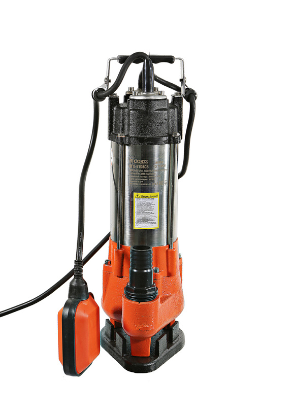 СОЮЗ НГС-9705СВ – погружной дренажный насос – предназначен для откачивания жидкости из выгребных ям, септиков, канализационных коллекторов. Имеет комбинированный корпус: основание выполнено из прочного чугуна – это необходимо для свободного погружения насоса в сточные водные массы, корпус двигателя – из нержавеющей стали, стойкой к воздействию агрессивной среды.  При мощности электромотора в 500 Вт модель характеризуется высокой производительностью – способна перекачивать за час до 6000 литров жидкости и обеспечивать ее подачу на высоту до 8,5 метров, осуществляя забор с глубины до 5 метров. Максимальная температура жидкости для насоса не должна превышать 35 градусов. Важная особенность модели СОЮЗ НГС-9705СВ – наличие в конструкции специального режущего узла, позволяющего измельчать крупные фракции, а также изготовленной и нержавеющей стали крыльчатки, устойчивой к окислительным воздействиям. Кроме того, насос снабжен устройством автоматического удаления воздушных пробок и имеет регулируемый поплавковый выключатель, который автоматически способен включать / выключать насос в зависимости от изменения уровня вод. Предусмотрена встроенаая термозащита – она автоматически отключает насос при перегреве и позволяет возобновить работу при последующем остывании до рабочей температуры.