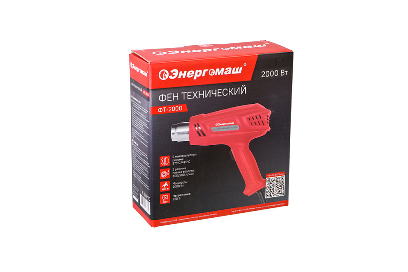 Энергомаш ФТ-2000 — надежный и простой в работе технический фен бытового назначения. Благодаря небольшой массе и компактным размерам модель обладает отличной маневренностью — уверенно контролируется и позволяет эффективное применение в условиях ограниченного пространства. Устройство может использоваться не только как мобильное, но и как стационарное — особая форма корпуса со специальной плоской основой дает возможность для большего удобства устанавливать фен в вертикальном положении. Инструмент имеет два рабочих температурных режима, которые совмещены с двумя скоростями воздушного потока: первый режим пониженной производительности обеспечивает максимальную температуру нагрева в 375°C при скорости выдува воздушного потока 300 л/мин, второй режим повышенной производительности — максимальная температура нагрева 495°C при скорости выдува воздушного потока 500 л/мин. Управление режимами происходит посредством специального переключателя. Для наиболее полного использования функционала в штатную комплектацию фена входят рефлекторное и редукционное сопла: рефлекторное сопло предназначено для разогрева пластиковых труб перед их изгибом в проектное положение в процессе монтажа, редукционное фокусирующее сопло применяется при точечной сварке, для герметизации стыков с помощью специальных наплавляемых лент, пайки медных труб и фитингов бесконтактным методом, при склеивании горячим способом любых материалов и в качестве переходника для фигурных или шлицевых насадок.