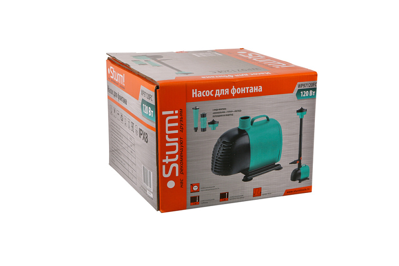 Фонтанный насос Sturm! WP97120FC имеет три насадки: каскад, гейзер и колокольчик. Предназначен для украшения водоемов в приусадебном участке. Не требует обслуживания. Имеет присоски для крепления к поверхности. Губчатый фильтр препятствует попаданию твердых частиц в механизм.