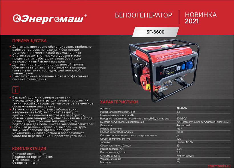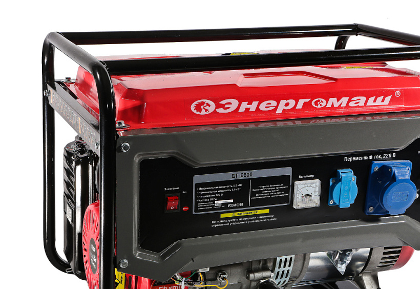 Генератор Энергомаш БГ-6600. Компактный однофазный генератор для организации мобильного энергоснабжения. Аппарат предназначен для мобильного обеспечения электроэнергией потребителей при отсутствии электроснабжения или в походных условиях. Отличный выбор для садового участка, гаража, небольшой торговой точки или организации удаленного рабочего места. Быстрый и легкий запуск двигателя и надежная работа генератора обеспечивается электронной системой зажигания и системой автоматической декомпрессии. Автоматическая система стабилизации напряжения (AVR) выполняет защиту от критичного снижения частоты и перегрузок, опасных для генератора, обеспечивая на выходе ровные параметры «чистой синусоиды», подходящей для большинства энергопотребителей. Прочный рамный каркас из закаленных труб защищает рабочие органы аппарата от механических воздействий и обеспечивают удобство перемещения и простоту установки. Система поддержания энергобезопасности автоматически отключает потребителей от генератора при возникновении короткого замыкания или перегрузки.