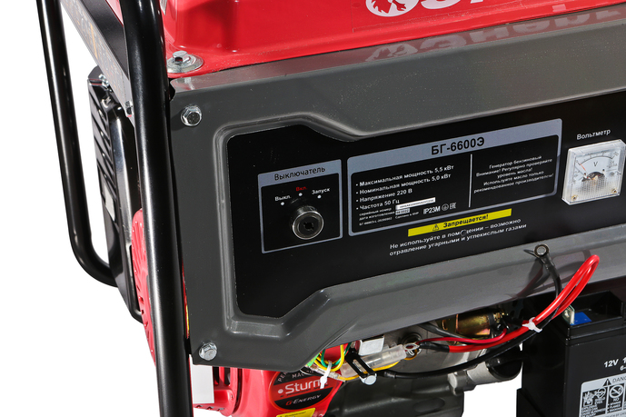 Две независимые розетки для прямого подключения, вольтметр для контроля напряжения, рукоятки дроссельной заслонки и топливного крана удобно вынесены на панель управления.