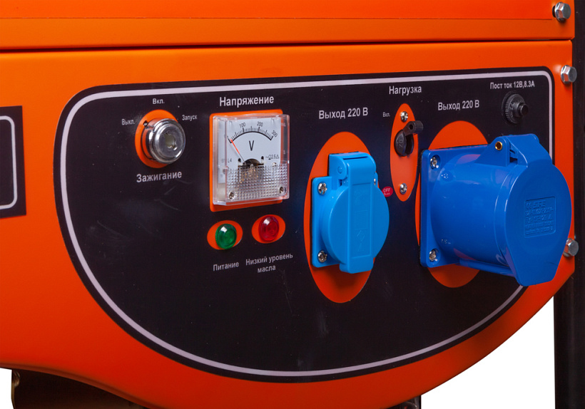 Панель управления оснащена контрольным вольтметром, двумя пыле-влагозащищенными розетками переменного тока 220В на 16А и 32А для универсального обеспечения электропитания потребителей различного класса.