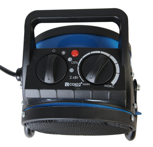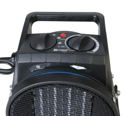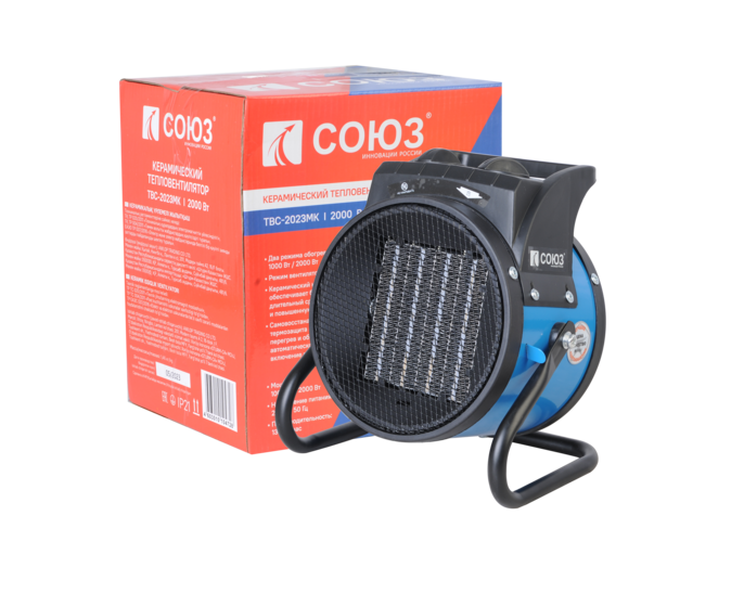 СОЮЗ ТВС-2023МК — мобильный керамический обогреватель для временного или постоянного обогрева жилых, производственных и вспомогательных помещений площадью до 30 м2. Главная особенность модели — применение в конструкции металлокерамического нагревательного элемента, благодаря большой площади теплоотдающей поверхности которого гарантируется быстрый нагрев. Для того, чтобы обеспечить высокую производительность воздушного потока, проходящего через нагревательный элемент и ускорить циркуляцию нагретого воздуха в помещении, обогреватель оснащен встроенным мощным вентилятором. Управление устройством осуществляется парой регуляторов, расположенных на верхней панели. С помощью первого регулятора пользователь выбирает один из трех режимов работы: вентиляция без нагрева / теплый обдув / горячий обдув. Второй регулятор — управление настройкой термостата, задача которого — поддержание постоянной температуры в помещении. Визуальному контролю включенного устройства способствует отдельный индикатор питания, размещенный на панели управления. Дополнительное удобство при использовании обеспечивает возможность регулировки направления воздушного потока посредством наклона корпуса обогревателя вверх-вниз, а также широкая опорная подошва по периметру, предотвращающая случайное опрокидывание устройства.