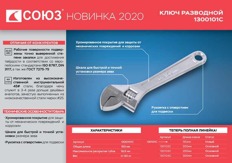 Разводной ключ 150мм, зев 19мм, хромированный, СОЮЗ
