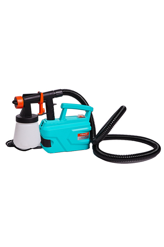 Sturm SG9660B – универсальный электрический краскораспылитель с выносной базой. Модель проста в эксплуатации и не вызовет затруднений у пользователей, не обладающих достаточными навыками работы с краскораспылителями. Главная особенность Sturm SG9660B в его компоновке: силовой блок, куда входят электромотор и нагнетающая турбина, и распылительный пистолет конструктивно разделены между собой и представляют отдельные элементы, взаимосвязь между которыми осуществляется лишь за счет двухметрового гофрированного шланга для подачи воздуха. Такая конструкция имеет существенные достоинства: лучший контроль распылительного пистолета, что способствует равномерному нанесению слоя краски на поверхность, отсутствие необходимости применения дополнительного сетевого удлинителя, за счет возможности работать на расстоянии до 4 х метров от розетки, возможность работы в условиях стесненного пространства, а также отличная приспособленность к высотным работам – в этом случае, силовой блок не сковывает движений пользователя, так как подвешивается на ремне (входит в штатную комплектацию) на плечо или за спину.