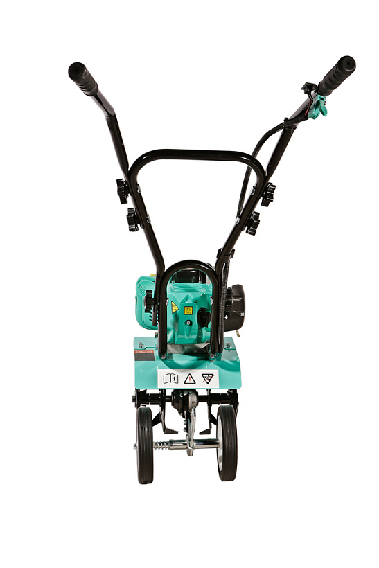 Транспортировочная колесная база при работе опрокидываются вверх, позволяя пользователю правильно выставить глубину обработки при помощи сошника.
