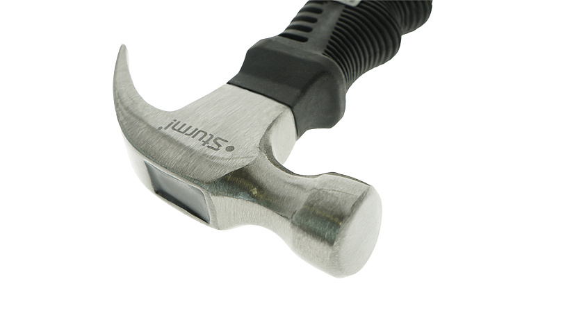 Молоток-гвоздодер; Компактный дизайн; Эргономичная обрезиненная рукоятка; Кованый боек; Твердость 48-57 HRC;