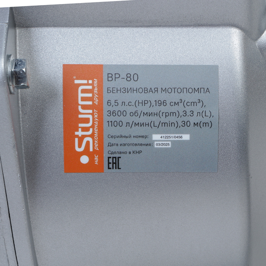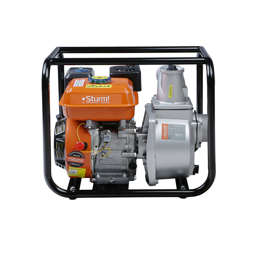 Sturm BP-80 – высокопроизводительная универсальная бензиновая мотопомпа для домашнего, жилищно-коммунального или строительного применения. Имеет классическую компоновку: двигатель и насос смонтированы внутри прочной усиленной трубчатой рамы, страхующей основные узлы от случайных повреждений, при транспортировке. Мотопомпа оснащается четырехтактным бензиновым двигателем рабочим объемом 196 см3 (мощность 5 кВт / 6,5 л. с.) с верхним расположением клапанов (OHV) и воздушным охлаждением. Благодаря ряду технических решений: коленчатому валу повышенной прочности и усиленной цилиндро-поршневой группе, силовой агрегат надежен и неприхотлив в использовании. На модели Sturm BP-80 установлен самовсасывающий насос центробежного типа, обеспечивающий высокую максимальную производительность 1100 л / мин – один из лучших показателей среди мотопомп аналогичной мощности. Агрегат способен осуществлять забор жидкости с глубины до 8 метров, что позволяет выкачивать воду из достаточно глубокого колодца или скважины, и демонстрирует высоту подъема (напор) жидкости – 30 метра. Модель проста в обслуживании и эксплуатации и не требует от пользователя каких-либо специальных навыков. Рекомендуемое топливо – бензин АИ-92. Запуск агрегата производится с помощью ручного стартера.