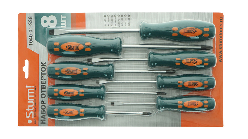 В комплекте 8 отверток: SL5x75; SL5x100; SL6x100; SL8x150;