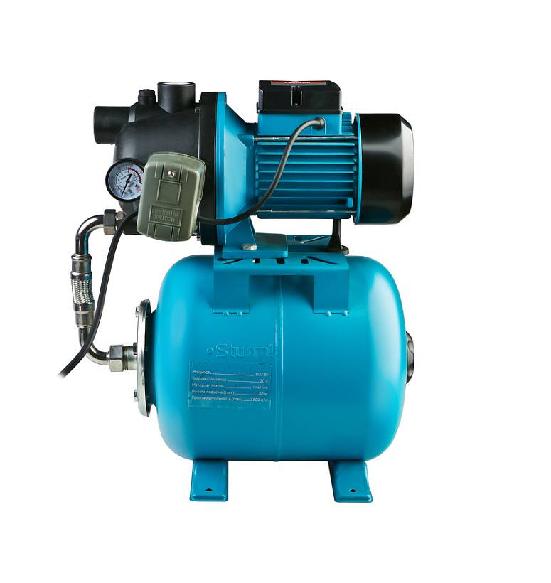 Sturm WP9780PL – автоматическая насосная станция – предназначена для создания давления в водопроводной сети загородных домов, дач и автоматического поддержания давления в заданном диапазоне, независимо от источника воды (водопровод, колодец, скважина и т д). Низкий уровень шума при работе позволяет устанавливать насосную станцию как вблизи, так и непосредственно в жилой зоне. Надежный асинхронный 800 ваттный двигатель в паре с мощным насосом, обеспечивают высокую производительность в 55 л/ мин и максимальный напор 40 метров. Забор воды осуществляется с глубины до 8 метров. Модель оснащена емким 20 литровым гидроаккумулятором с внутренней мембраной из натуральной резины, а также механическим реле давления для поддержания заданного уровня давления в водопроводе. Долговечности работы насосной части способствует крыльчатка, изготовленная из антифрикционного полимера PPO.
