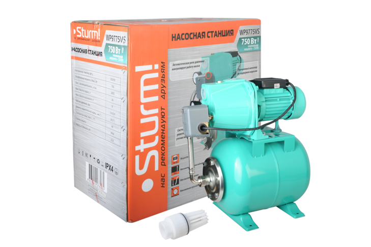 Sturm WP9775VS – автоматическая насосная станция – предназначена для создания давления в водопроводной сети загородных домов, дач и автоматического поддержания давления в заданном диапазоне, независимо от источника воды (водопровод, колодец, скважина и т д). Низкий уровень шума при работе позволяет устанавливать насосную станцию как вблизи, так и непосредственно в жилой зоне. Надежный асинхронный 750 ваттный двигатель в паре с мощным насосом, обеспечивают высокую производительность в 44 л/ мин и максимальный напор 35 метров. Забор воды осуществляется с глубины до 8 метров. Модель оснащена емким 24 литровым гидроаккумулятором с внутренней мембраной из натуральной резины, а также механическим реле давления для поддержания заданного уровня давления в водопроводе. Долговечности работы насосной части способствует крыльчатка, изготовленная из антифрикционного полимера PPO.