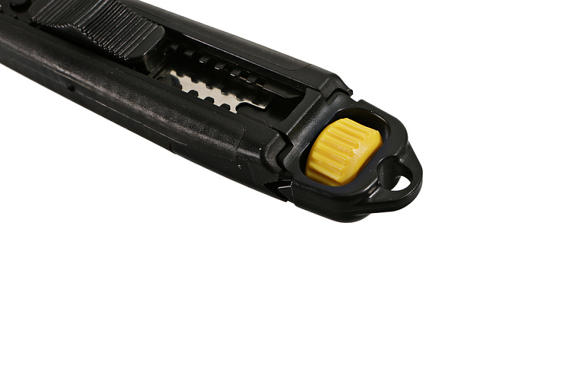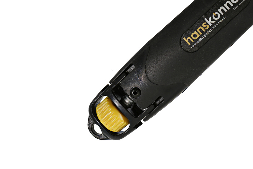 Строительный нож Hanskonner SolidFixation (усиленная фиксация лезвия) подходит для работ с высокими нагрузками, требующих повышенной точности и интенсивности. Благодаря корпусу из чистого высококачественного пластика и сверхпрочной металлической направляющей достигается улучшенная устойчивость конструкции при давлении на инструмент. Обрезиненная поверхность с упором под большой палец обеспечивает полный контроль ножа. Лезвие из высококачественной стали SK2 с трёхгранной заточкой и дополнительной обработкой лазером служит в 5 раз дольше стандартного. Уникальный запатентованный фиксирующий винт плотно прижимает режущий элемент к направляющей, что позволяет полностью передать усилие на рабочую кромку.