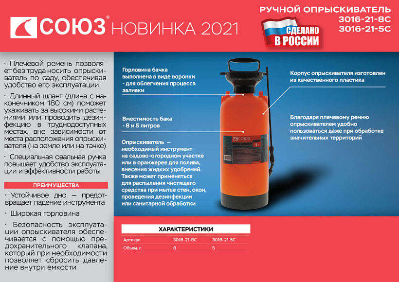 В комплект поставки входят наплечный ремень, устройство для регулировки струи, стержневой распылитель, насос, резервуар, насадка.