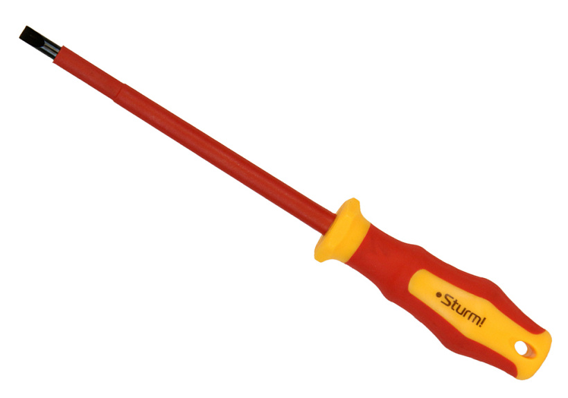 Отвертка Sturm! 1040-17-SL6-150 с многокомпонентной ручкой эргономичной ручкой. Отвертка для безопасной работы на оборудовании с максимально допустимым напряжением 1000 В. Многогранный край ручки для защиты от перекатывания отвёртки на рабочем месте.