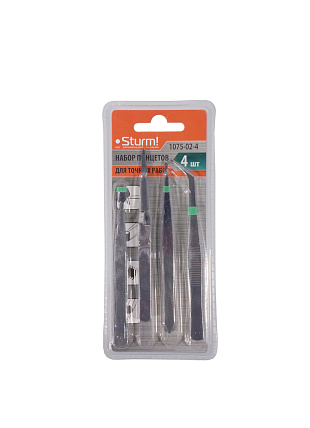 - Набор пинцетов Sturm! 1075-02-4 Комплект состоит из 4 видов пинцетов: прямого пинцета, пинцета с захватом под углом 45, пинцета с изогнутым широким захватом и пинцетом обратного действия.
