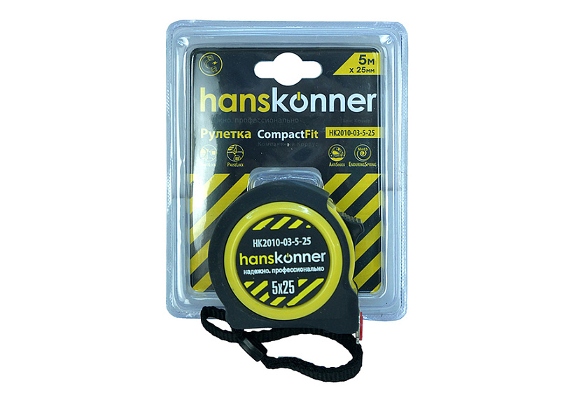 Рулетка 5x25мм, 2 стопа, компактный корпус, мощный магнит, Hanskonner