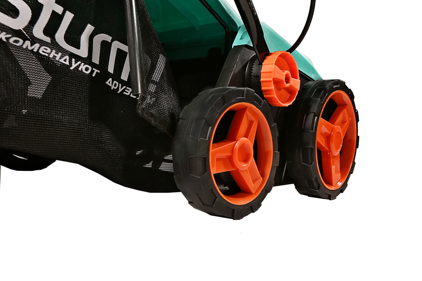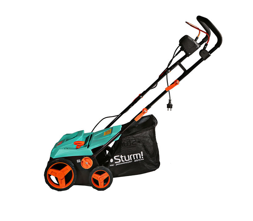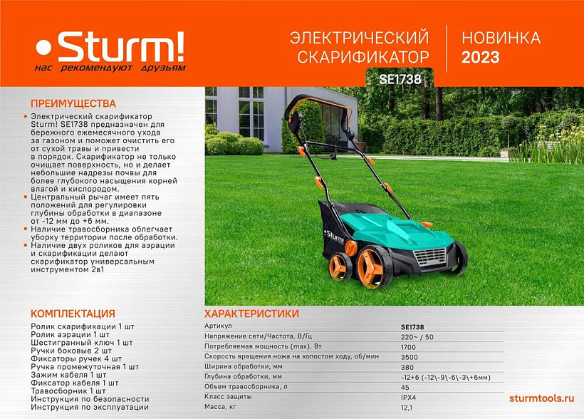 Sturm SE1738 – мощный и производительный электрический скарификатор 2 в 1. Предназначен для ежемесячного бережного ухода за газоном: очищает его от сухой травы, а также благодаря специальным ножам, производит небольшие надрезы в верхнем слое почвы, через которые корни насыщаются влагой и кислородом. Модель обладает умеренными габаритными размерами и оснащена складными рукоятями, что в значительной мере способствует удобству хранения. Относительно небольшой вес инструмента, положительно влияет на комфорт его перемещения. Конструкция скарификатора Sturm SE1738 предусматривает наличие двух отдельных съемных роликов-насадок: для скарификации и аэрации – в зависимости от поставленной задачи, пользователь устанавливает на скарификатор нужную оснастку. Инструмент оборудован 1700 Вт электродвигателем, который позволяет высокоэффективную обработку в широком диапазоне от –12 до +6 мм. Регулировка глубины обработки – централизованная, ступенчатая, на пять положений. Обеспечивается посредством перемещения удобного рычага, размещенного в верхней части корпуса. Ширина обработки за один заход составляет – 380 мм. В штатную комплектацию скарификатора Sturm SE1738 входит вместительный (45 литров), нейлоновый травосборник, существенно облегчающий уборку территории после обработки.