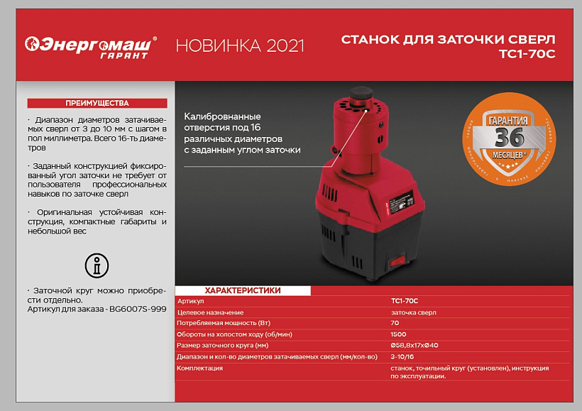 Станок для заточки сверл Энергомаш ГАРАНТ ТС1-70С